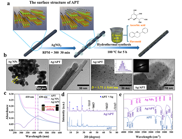 研究人員采用檸檬皮提取物介導的低溫水熱法,利用所含抗壞血酸與多酚類物質(zhì)將Ag+還原為Ag0,并原位均勻錨定于凹凸棒石納米棒晶表面,構筑了銀納米粒子尺寸小于2 nm的Ag/凹凸棒石復合納米酶(Ag/APT)(圖1)。該礦物復合納米酶比AgNPs具有更大的比表面積和更多的活性位點。對多重耐藥菌性耐甲氧西林金黃色葡萄球菌(MRSA)和產(chǎn)超廣譜β-內(nèi)酰胺酶大腸桿菌(ESBLs-E.coli)均表現(xiàn)出優(yōu)異的廣譜抗菌活性。